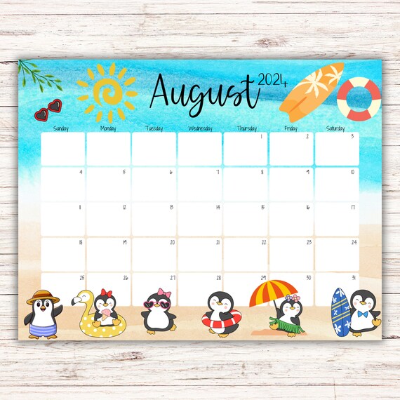 EDITABLE August 2024 Calendar, Beautiful Summer, Cute Penguins