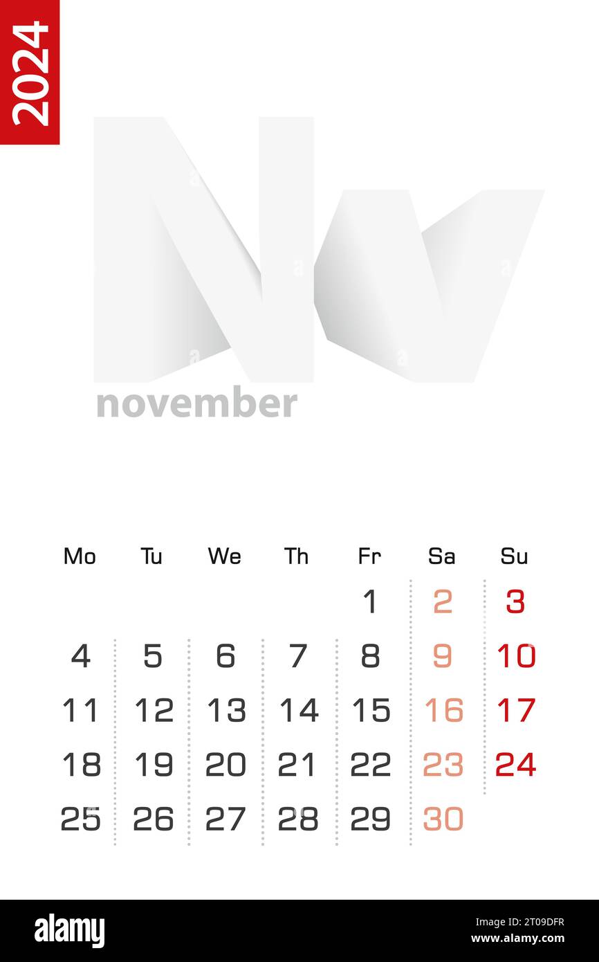 November 2024 Calendar in a Minimalist Style. Vector Stock Vector