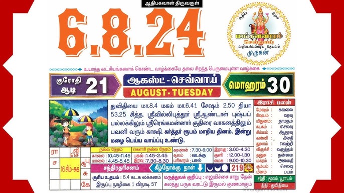 Tamil Calendar August 2024 With Rasi Palan – Tamil Nadu lies in the southernmost part of the Indian subcontinent. Its capital and largest city is Chennai. Tamil Nadu is the eleventh-largest state in India by area and the sixth-most populous. . Ramadan Calendar 2024 Rasi is all about Rasi Ramadan time including today Sehri Time at 02:53 and iftar time at 8:54 . Today, on Sunday 25 Aug, 2024 is 21 Safar 1446 of the islamic month. There is a .